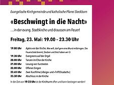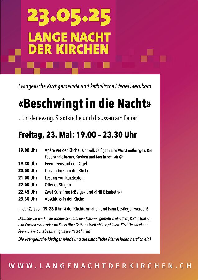 Herzliche Einladung zu der ökumenisch gestalteten Langen der Nacht der Kirchen. Vor der Kirche gemütlich unter Platanen oder am Feuer plaudern und philosophieren, in der Kirche zuhören, sich bewegen und singen oder einmal in der Dunkelheit auf den beleuchteten Kirchturm steigen und das nächtliche Steckborn geniessen. Das ist die Lange Nacht der Kirchen.