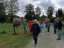 (hw/pd) Erfreulich, dass sich trotz etwas durchzogenen Wetterbedingungen total 23 Teilnehmerinnen und Teilnehmer zur Postautofahrt nach Frauenfeld entschlossen haben, dem Ausgangspunkt unserer Wanderung vom 1. September 2020, um die bekannte Pfyner Badibeiz im «Frankrichli» mal per pedes und abseits von Strassenverkehr zu besuchen. Das Unwetter vom vorletzten Wochenende durchkreuzt die Planung. Die Wanderroute führt via Unterführung im Frauenfelder Bahnhof durch den Murg-Auen-Park. Hier fallen uns im Freien aufgestellte künstlerische Exponate aus Stein, Metall und Holz auf, die von Kunstschaffenden bis zum 4. September fertiggestellt wurden. Die Skulpturen, Plastiken und Installationen weiterer Kunstschaffender sind bis zum 31. Oktober 2020 hier ausgestellt. Die Route ist Teil der 6. Etappe des Thurwegs Nr. 24 (von Weinfelden nach Frauenfeld) und verläuft vorerst im Wesentlichen entlang der Murg, doch wird unser Marsch jäh gestoppt – wir müssen ein zum Glück nur kurzes Stück zurückgehen und einen anderen Weg einschlagen. Der Grund: Die riesigen Regenmengen des vorletzten Wochenendes hatten Thur und Murg in reissende Ströme verwandelt und angrenzenden Wiesenflächen arg zugesetzt; die Wanderwege zum Teil unpassierbar gemacht. Kein Problem also für Brigitta, unsere heutige Wanderleiterin – sie hat ja einen «Plan B».